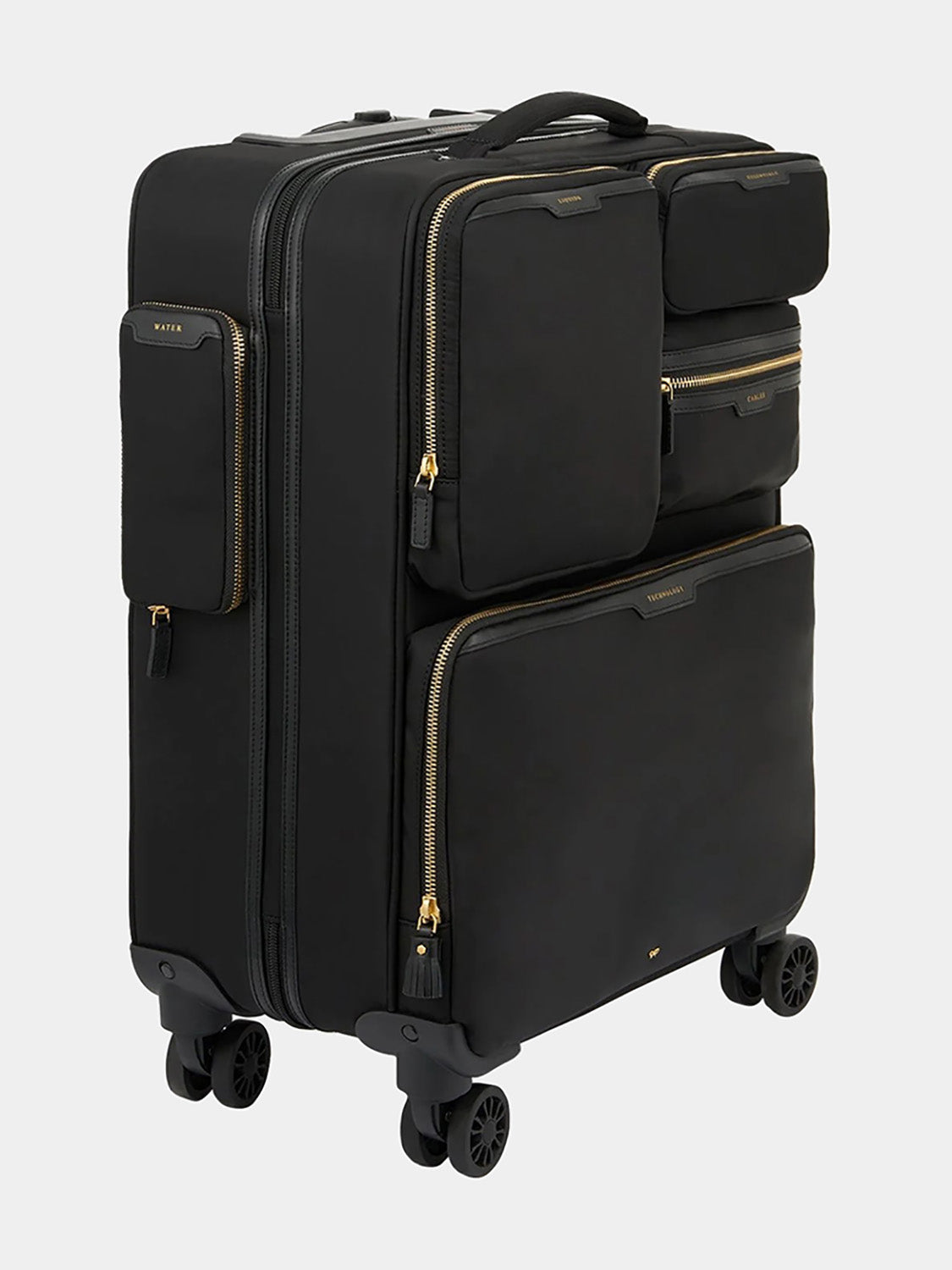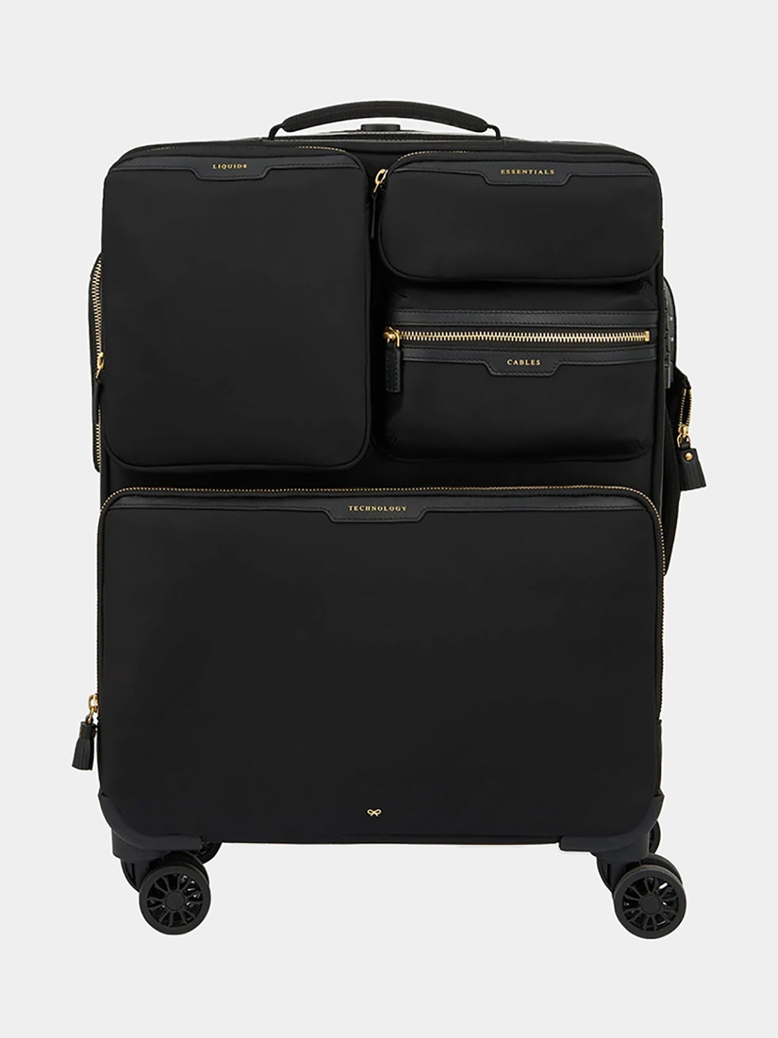 - External features: Zipped front pockets for LIQUIDS, CABLES, ESSENTIALS and TECHNOLOGY, top and side handles, large D ring, flat zip pulls, tassel zip pull, side pocket for water bottle, zipped back pocket for PAPERS, security lock, AH signature bow.